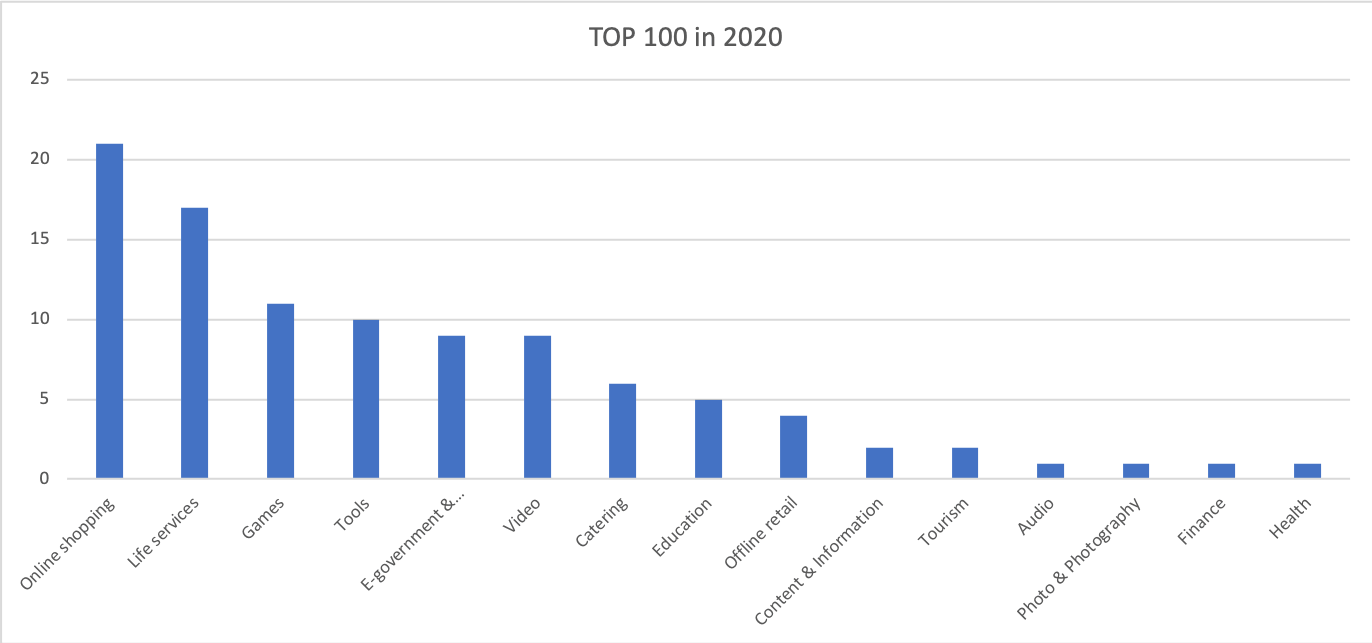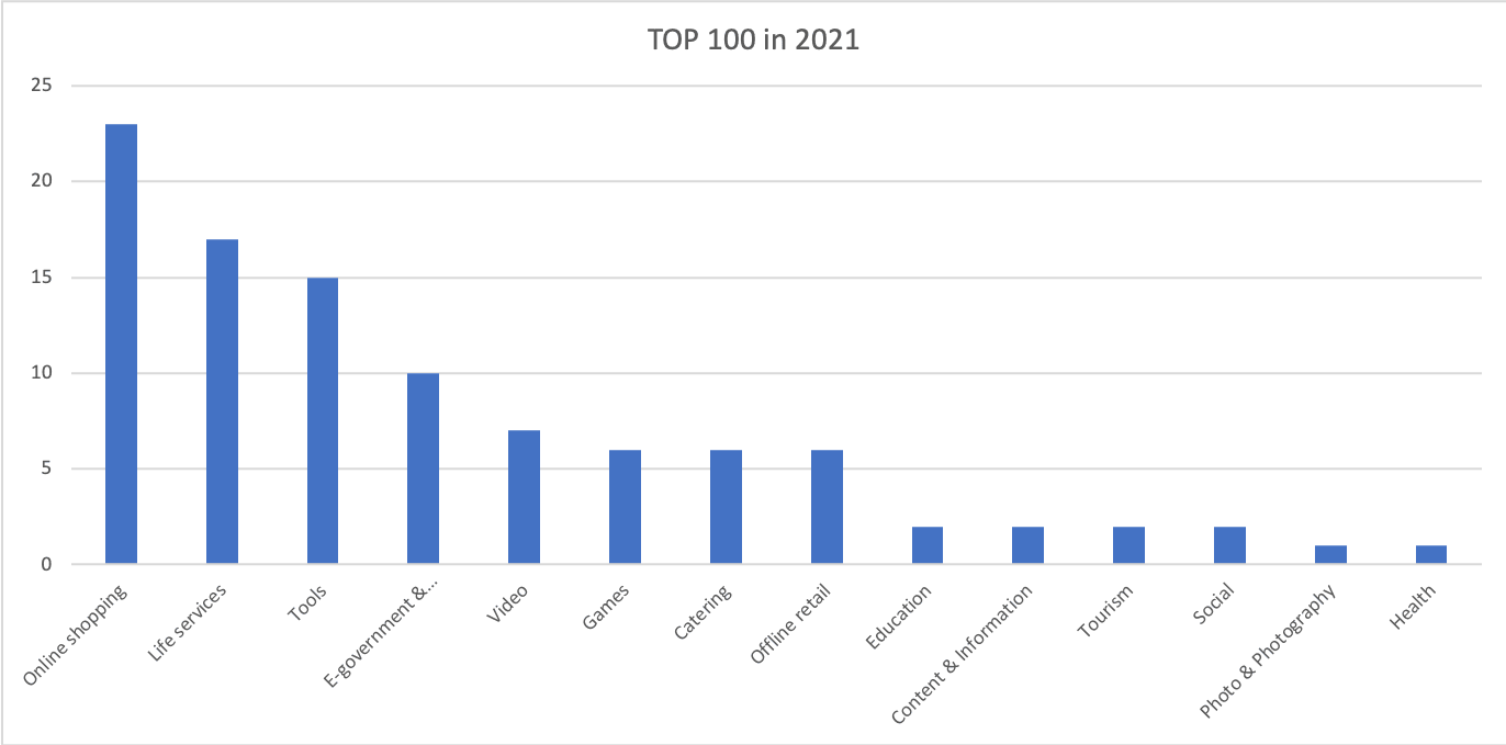 Based on the findings of our review of the mini-program index TOP100 list on Alading's mini-program statistical platform for each month from 2020-2021, online shopping, life services, and mini-program as useful tools have remained the three most popular industry categories and have occupied about half of the list in most months. Other industry categories on the list are: Video, Games, Social, Catering, Content & Information, E-government & Public welfare, Offline retail, etc.