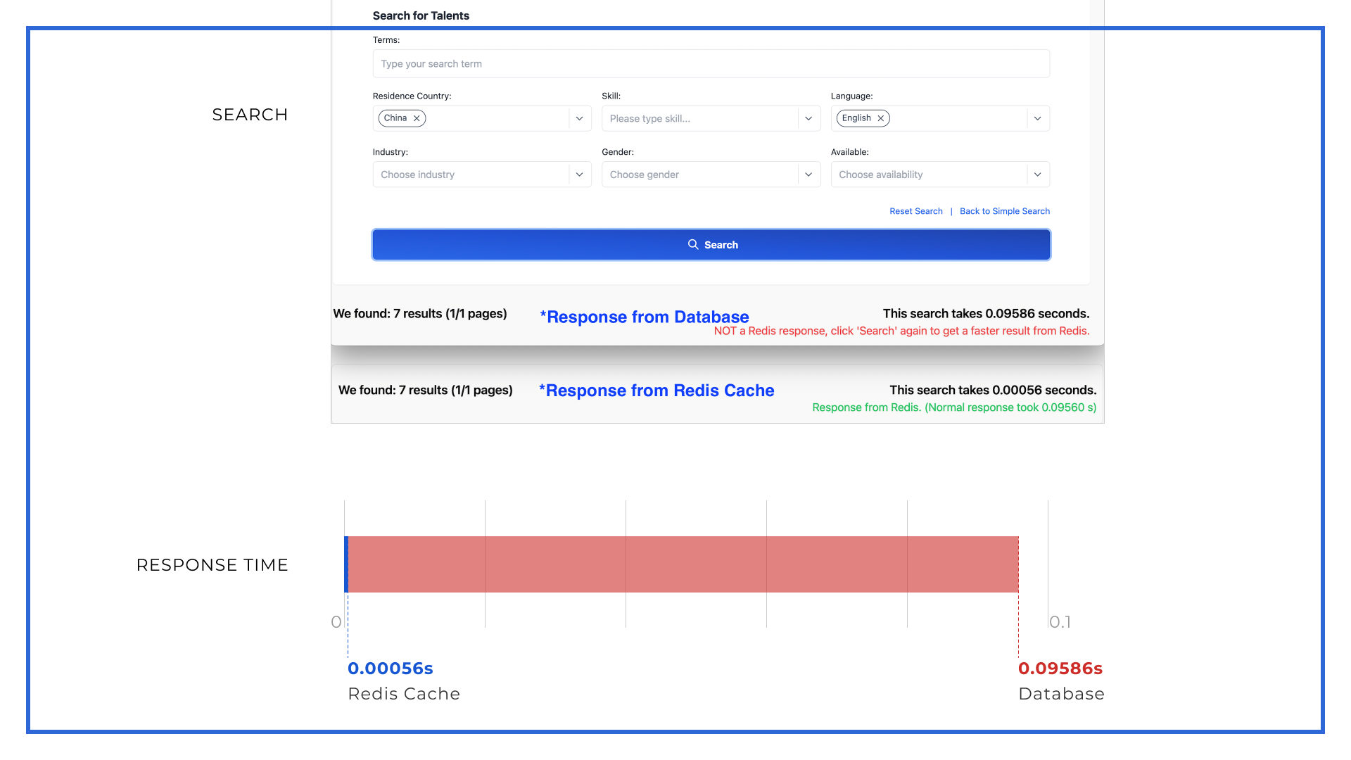 You can see from our demo that if you search with the same criteria. The second time, Redis enables a much shorter response time.