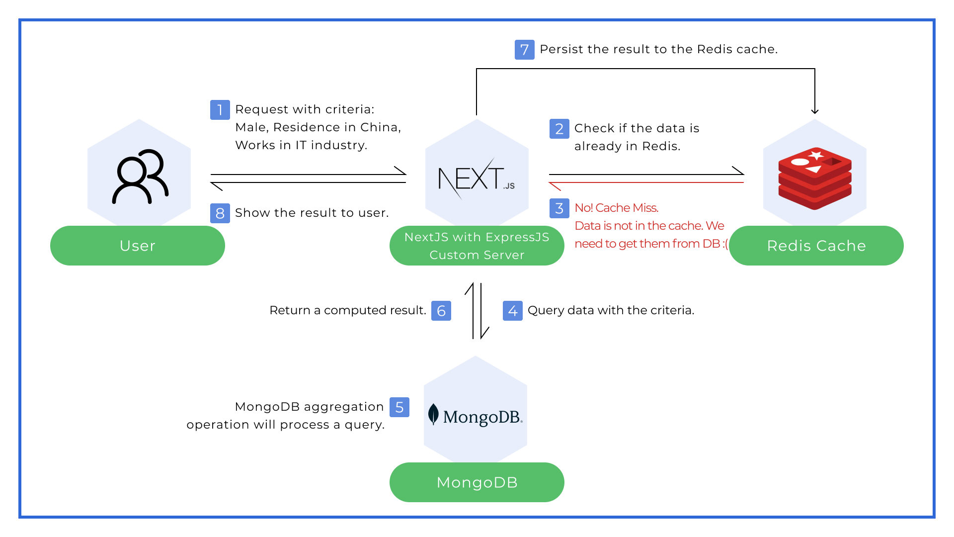Now it's time to use the Redis cache to improve the process. We have installed a Redis instance and then written a function on the server-side application to determine whether a query has been requested before and the responded data is already in the Redis cache.