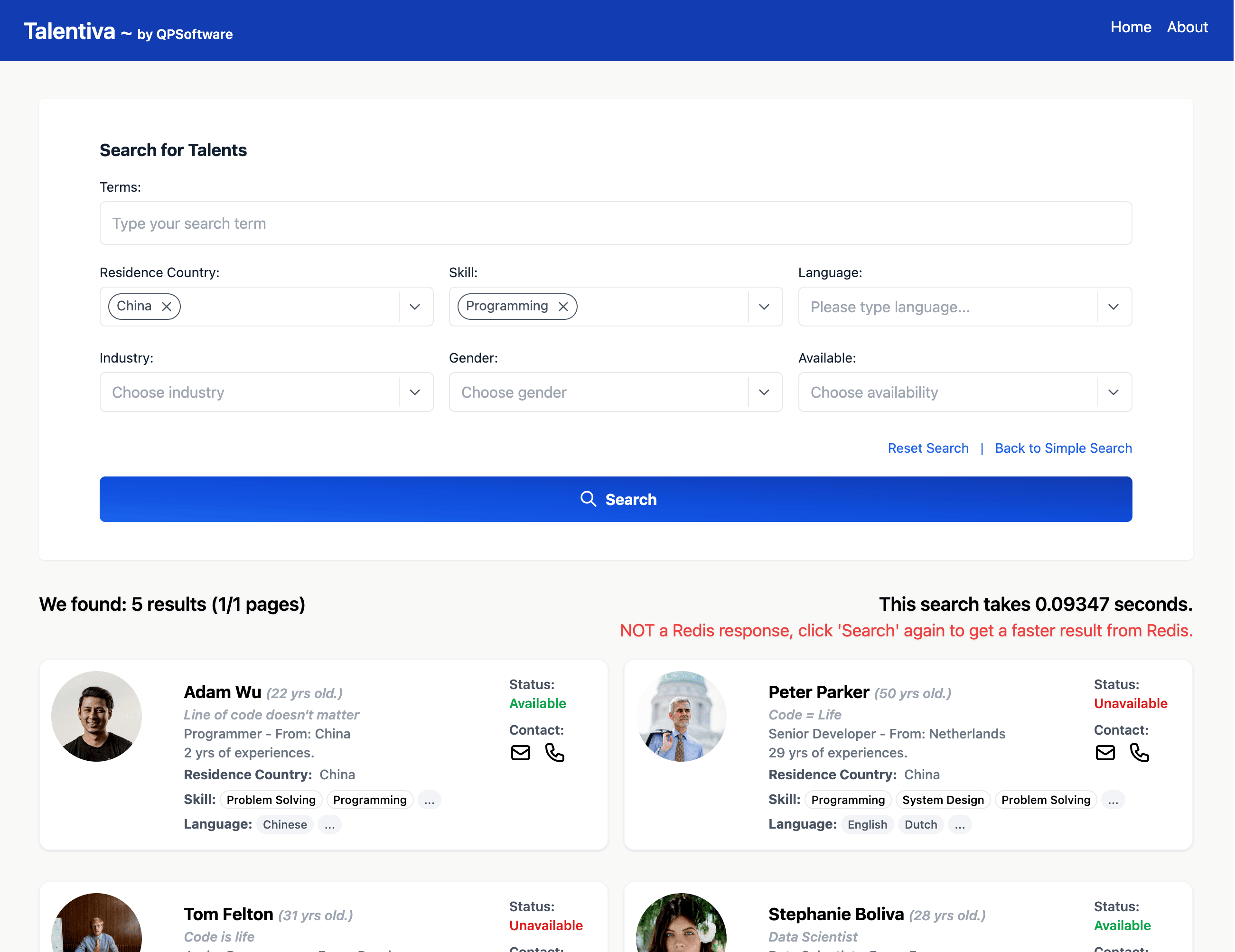 Here's Talentiva, a talent database that contains many personal profiles for professional career searching. We added profile attributes like country of birth, current country, skills, and languages to add more complexity. Users can search on different criteria to get different results based on their requests.