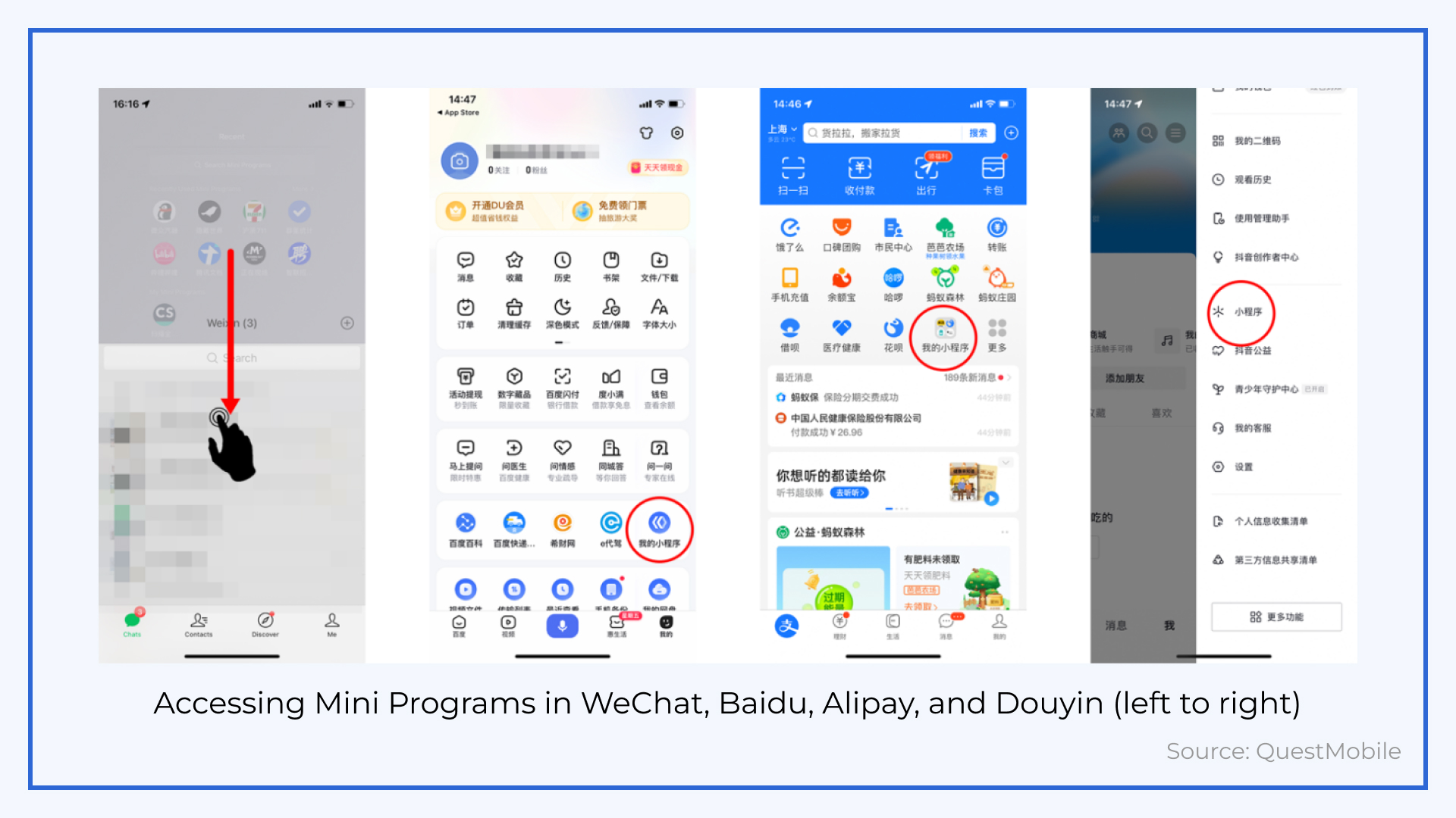 Users access Mini Programs from within the host Super App. Mini Programs in Super Apps range from being on the home screen (Alipay) to being accessible via a simple gesture (WeChat) or light menu diving (Douyin, Baidu).