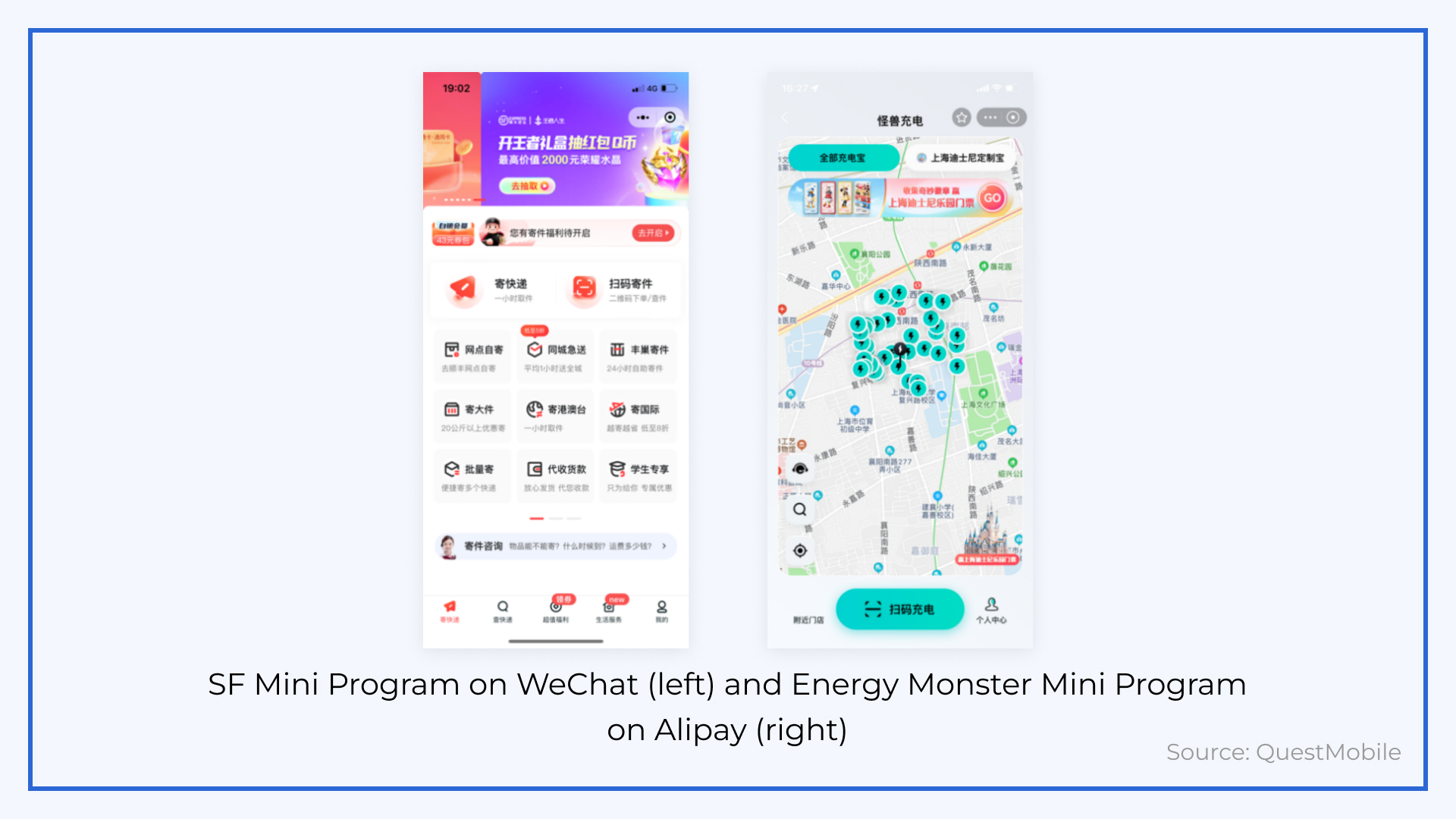 According to Quest Mobile, in 2022, the most popular type of Mini Program across Super Apps are daily services. These include services such as mobile chargers (Energy Monster), phone bill top ups (China Telecom), bike sharing (Hello Bike), food delivery (Eleme), and package delivery services (SF 顺丰快递) among others. This category of Mini Program makes up 43%, 52%, and 26% of the 100 most used Mini Programs on WeChat, Alipay, and Baidu respectively.