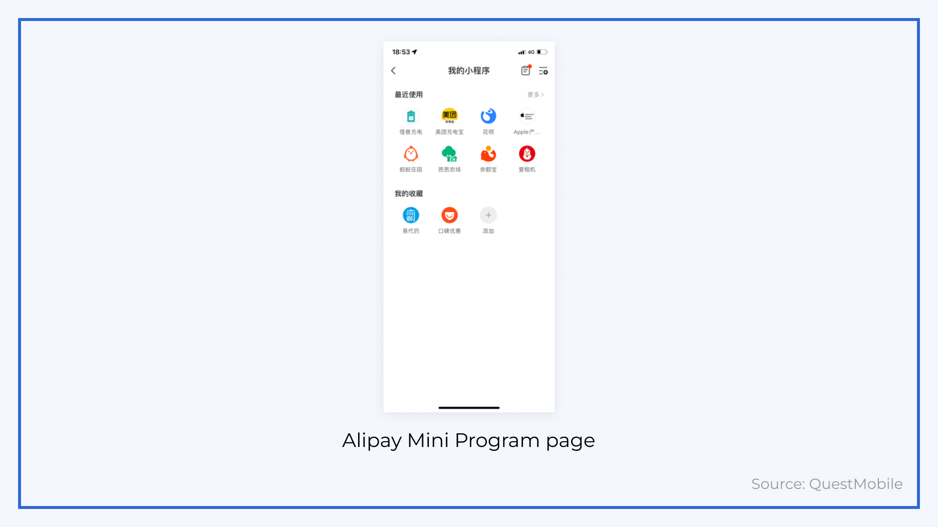 For the Super App itself, Mini Programs ensure users are always on their platforms, as they do not need to the leave the application to access third party functions. For example, Alipay users can use the Didi Mini Program to hail and pay for a taxi without needing to download the full Didi app.