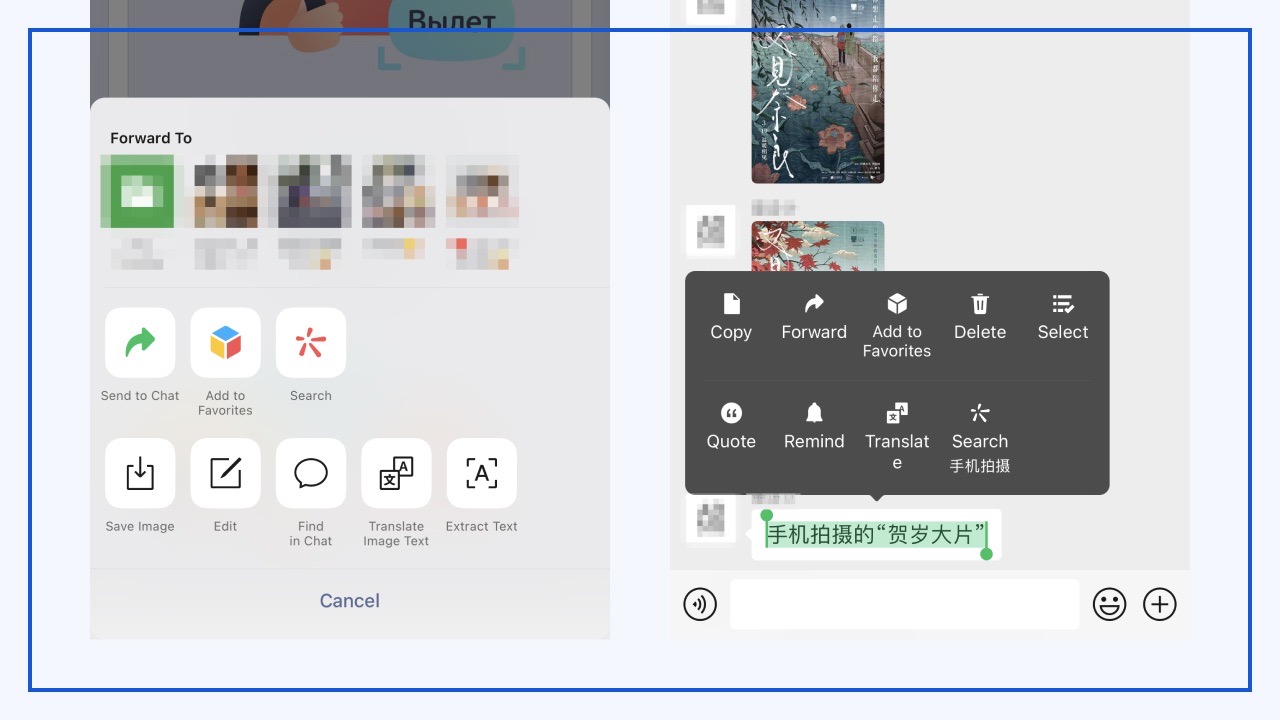 WeChat has developed a variety of features for language processing. By long pressing on messages in chats, you can automatically translate messages into the language you’ve set for WeChat.