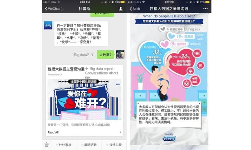 The campaign envisioned by Durex is a perfect showcase of what you can do with an H5 page. Thanks to the embedding of a private ChatBot, they encouraged the audience to talk freely about a taboo topic in China like safe sex. They included a private chat where users could talk privately with relationship experts.