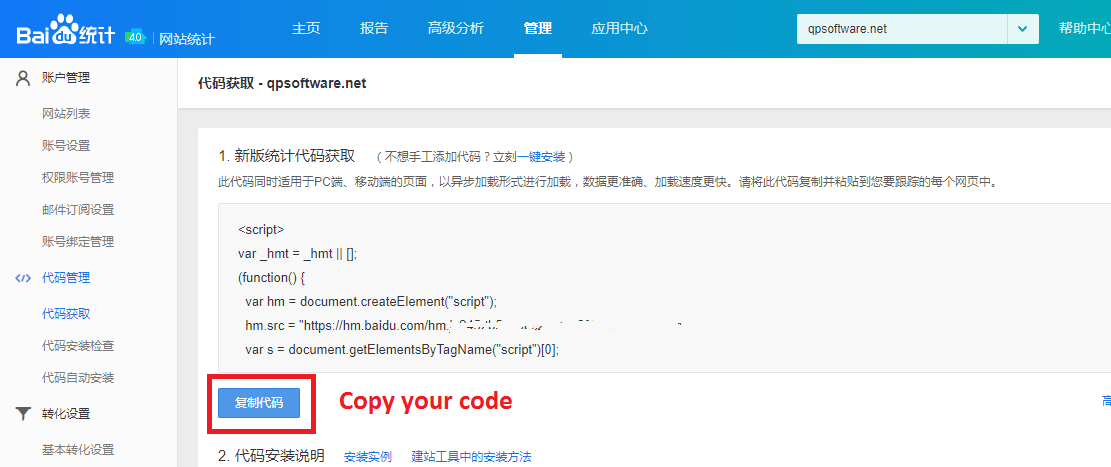 3- Finally you can find your JS Baidu tracking code, just click on copy and add the code to the </head> tag on all pages of the site.
